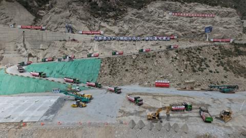 孟底沟水电站施工现场,数十辆新动力自卸车不远离输送截流石料。