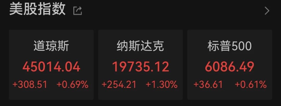 胁制收盘,说念指涨0.69%,报45014.04点;标普500指数涨0.61%,报6086.49点;纳指涨1.3%,报19735.12点。三大股指均创下收盘历史新高。