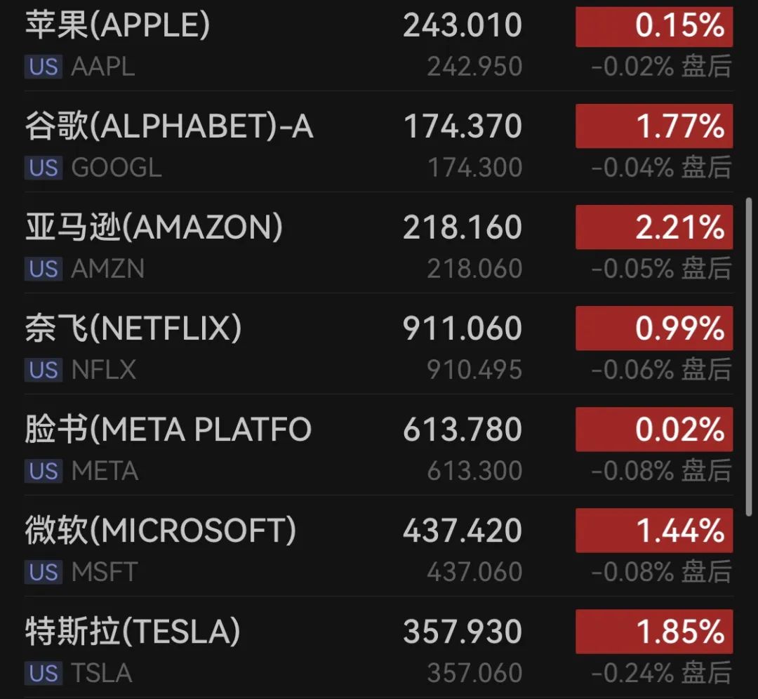 个股方面,大型科技股全线飞腾,亚马逊涨逾2%,特斯拉涨近2%,谷歌涨逾1%,微软涨超1%,苹果涨0.15%,脸书涨0.02%。